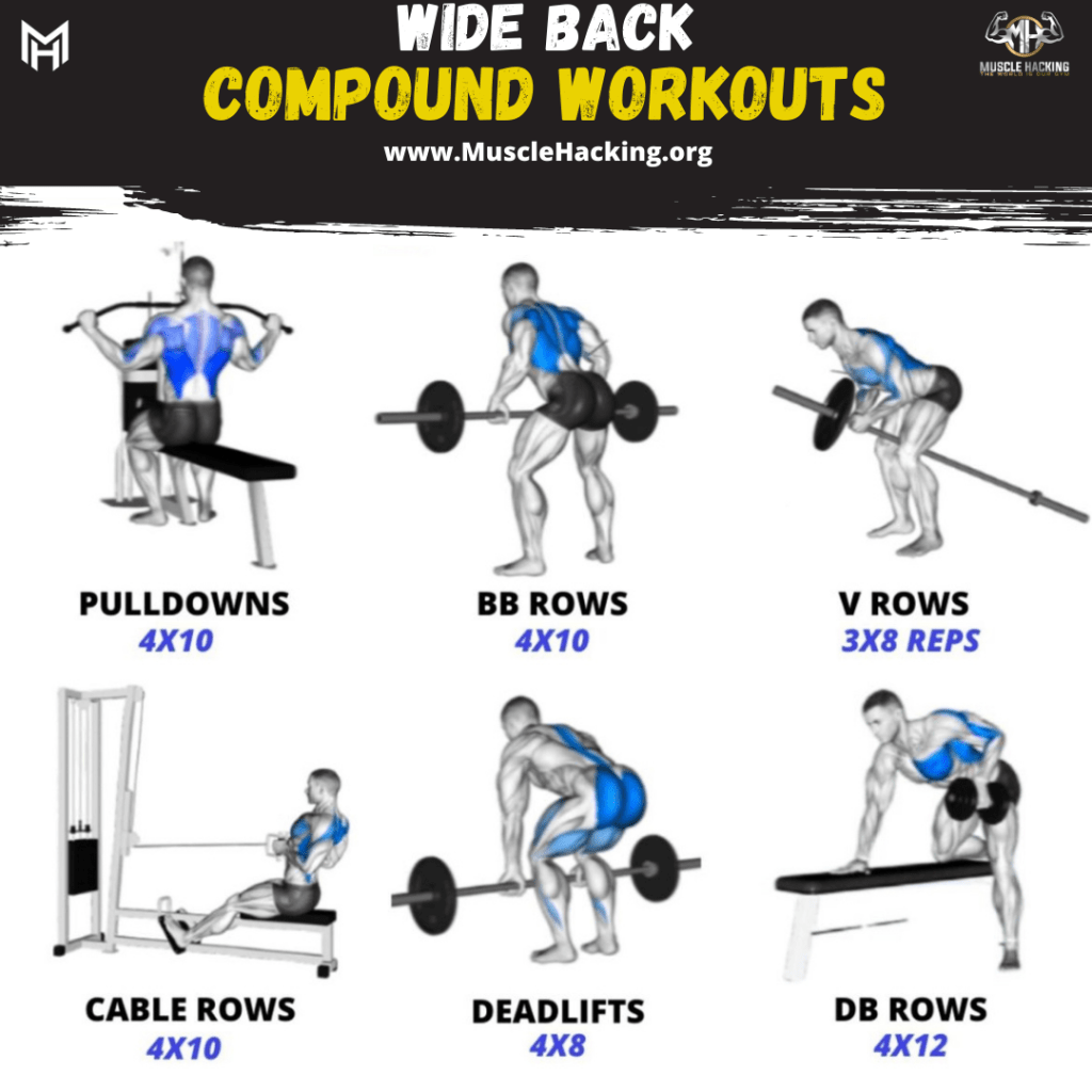 Wide Back Workout This is mainly for more advanced gym goers as it contains over 20 sets for your back muscles. If you really want to do this, I’d recommend starting with your heavier lifts, like the Deadlift and Barbell Rows/Pull-Ups, and then move over to your Lat Pulldowns, and then you can finish with Cable, V-Rows, and DB rows. You can use higher weights, lower reps, and longer rest time for your first exercises, and then decrease weights increase reps, and decrease rest time as you move through your workout. As always: Focus on performing the exercises with proper form and technique. Approach this with caution